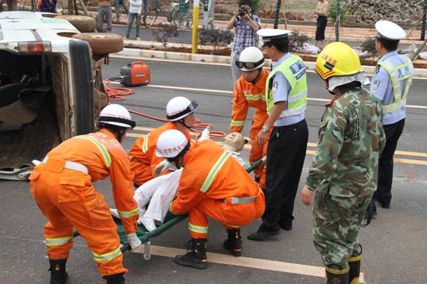 为进一步完善道路交通事故的预防、处置应急救援机制,及时、高效、有序地组织实施道路交通事故应急救援,最大限度的减少交通事故人员伤亡和财产损失,切实加强县交安委各职能部门之间的协调配合,提升道路交通事故应急救援和处置的能力和水平,进一步完善应急救援的长效机制。6月27日上午,富民县组织开展2014年道路交通事故应急演练,县安监局、县交运局、县医院、县公安局交警大队、消防大队及富昌汽车救援服务中心等部门参加了演练。